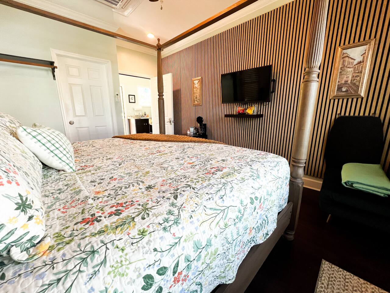 Built in 1888, this historic property occupies two city lots, including a main house, carriage house, and garden. The carriage house, built in 2020, offers two private rooms, each featuring one bedroom and one bathroom, with a shared kitchenette. You will be staying in the carriage house unit B You'll love our location, within walking distance of great restaurants, a gas station, and coffee shops, and only two blocks from the beautiful Forsyth Park. A bus stop, the free DOT shuttle, and trolley tour stops all within two blocks. Our room is small but inviting, with everything needed for your stay, including: - Comfortable King-sized bed - WIFI - coffee and tea in your room - Shared kitchenette with wine glasses, basic utensils and cleaning products - Desk/Workspace - Roku